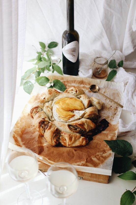 Corona de hojaldre con camembert, melocotón asado y nueces