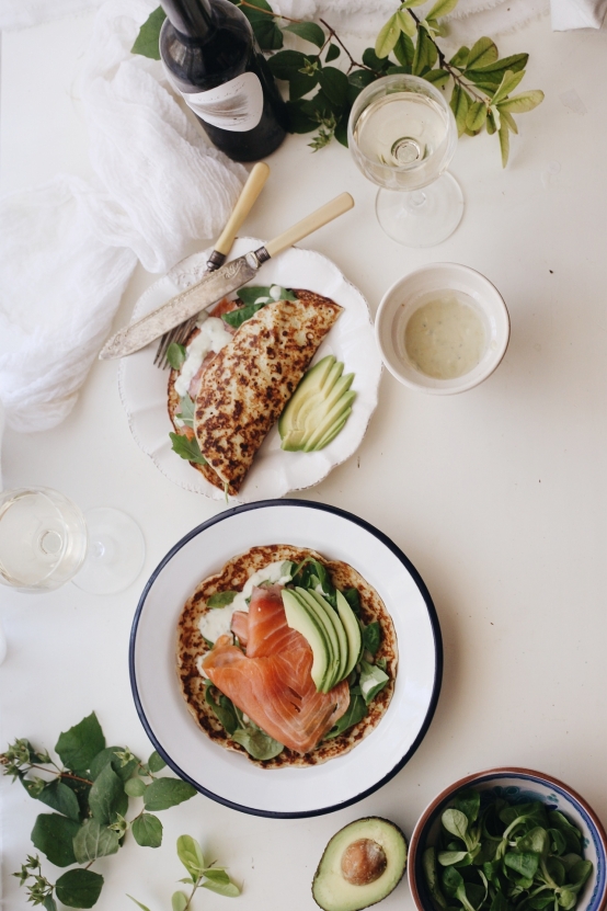 Crêpes con crema de queso azul y salmón ahumado