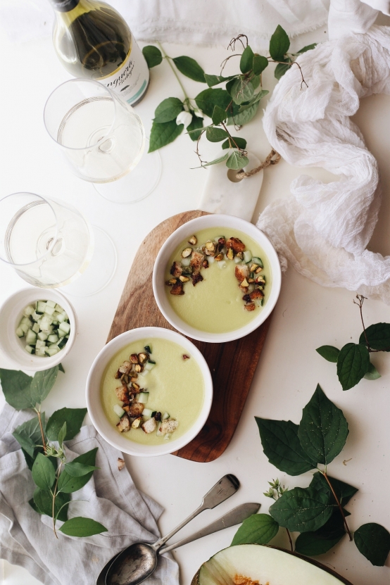 Gazpacho de melón con crujiente de pistacho y limón