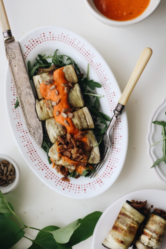 Involtini de berenjena rellenos de picada de seitán y nuez con salsa de pimiento piquillo