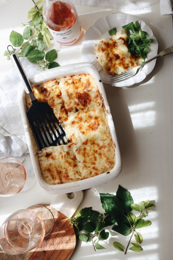 Lasaña de salmón, bacalao y gambas con cebolla caramelizada