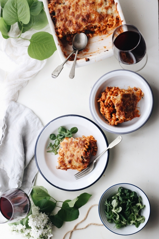 Pasta gratinada con picada de soja especiada